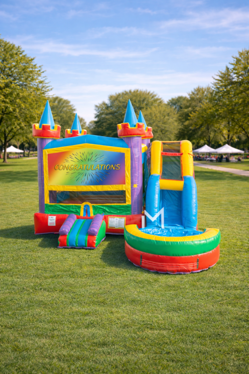 Bring extra excitement to your next party with the Lucky Combo Wet or Dry, a colorful combo rental that gives kids plenty to enjoy in one unit. It features a roomy bounce area for jumping and playing, a fun slide for added action, and a splash pool that can be used wet or dry depending on the event. The interior basketball hoop adds another playful activity, making it easy for guests to stay entertained. With its bright, castle-style look and versatile design, this rental is a great fit for birthdays, family gatherings, and warm-weather celebrations alike.