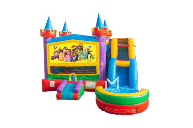 Power up your party with the Mario Bros Themed Combo Bounce House from Party Right Rentals! This 24x24x16 ft inflatable playground is a joyous journey for all ages, transporting guests straight into the colorful world of Nintendo's iconic duo. The large bounce area is your Mushroom Kingdom, perfect for lively jumps and acrobatic fun. The interior basketball goal offers an extra challenge, reminiscent of Mario and Luigi's playful competitiveness. The real star of the show is the wet or dry slide, providing a thrilling ride that's akin to a warp pipe adventure. Adorned with vibrant Mario Bros-themed artwork, this bounce house invites your party-goers to join the legendary plumbers on a day of unforgettable fun. With the Mario Bros Themed Combo Bounce House, your party isn't just a celebration—it's a Super Mario extravaganza!